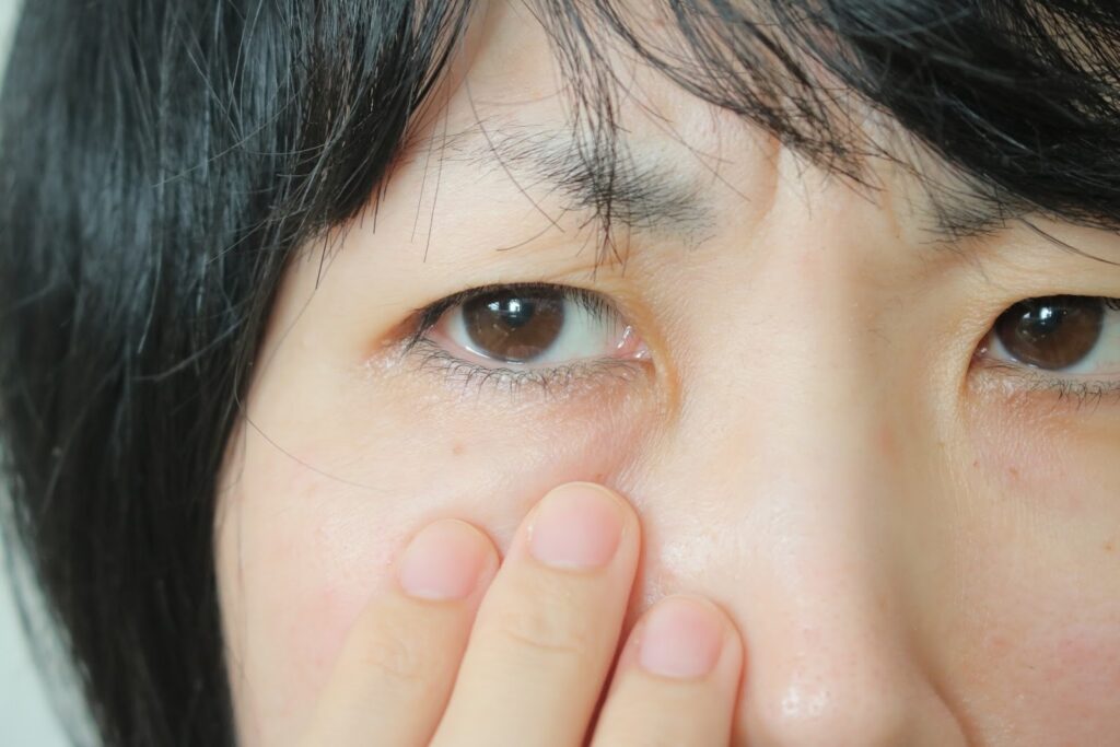 赤クマはまぶたの炎症や血管拡張が関係しているとされています。アトピーや花粉症、アレルギー性鼻炎などで慢性的な炎症が起き、血管が拡張して赤っぽいクマが目立つようになります。目の充血やかゆみを伴うこともあり、風邪やアレルギー症状が出やすい季節に目立つ場合が多いです。