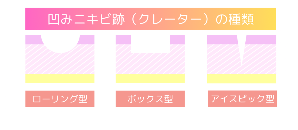 | ボックスカー型 | ・四角・丸い形の凹み ・直径2〜5mm | 比較的深く、底が平ら | 表皮〜真皮が面で凹んでいる | レーザー・注入 |