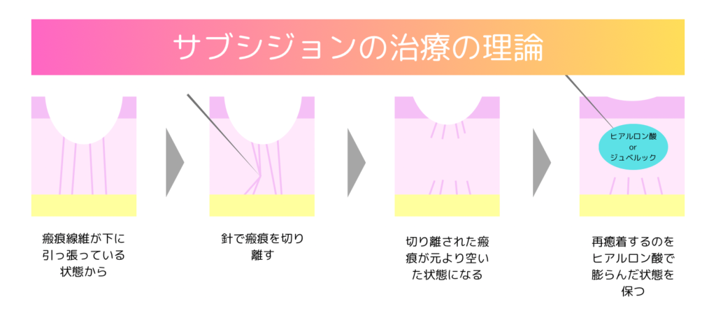 サブシジョンはクレーターの原因とされる組織の癒着を切り離すため、「適応が合っていれば」期待した効果が得られやすいことが特徴です。