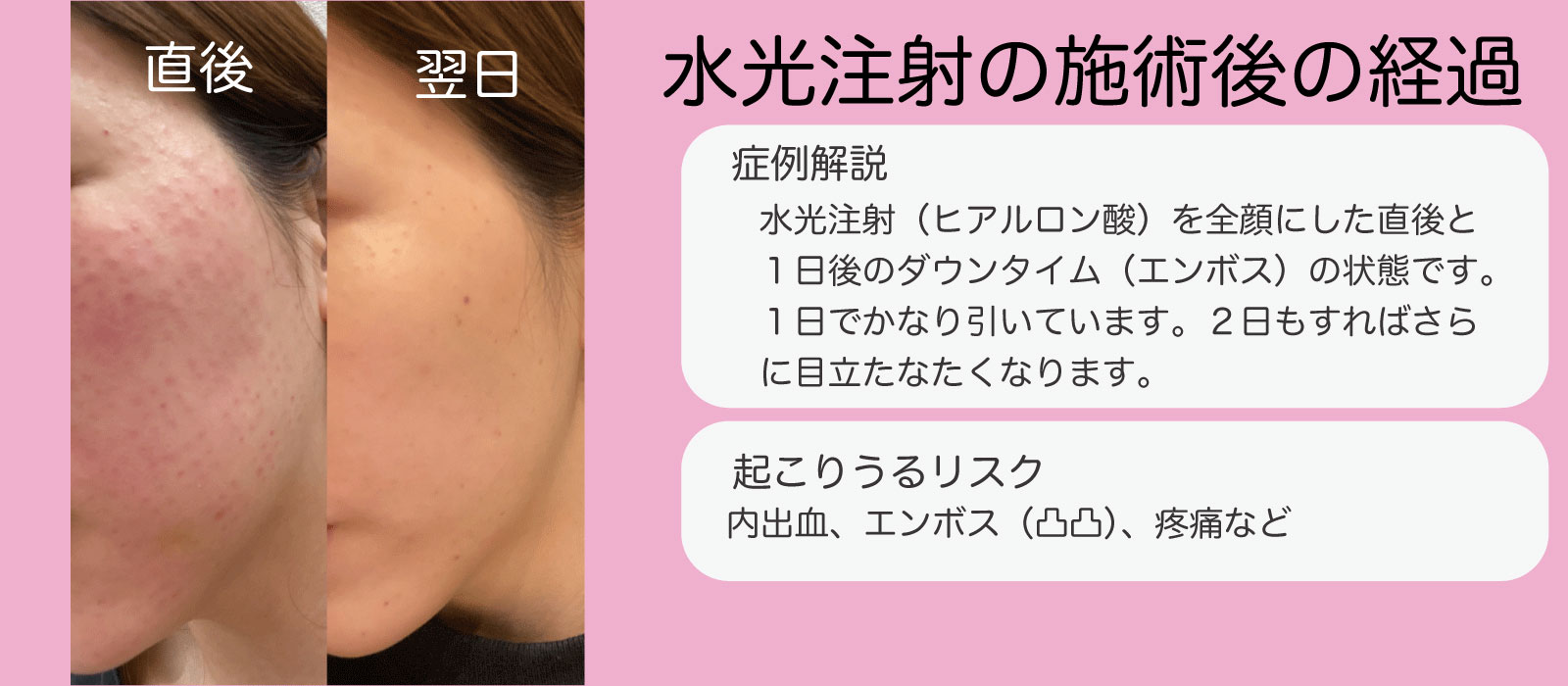 - 肌がボコボコになるエンボスが当日現れてます。針を刺したところが跡とともに2〜3日で目立たなくなります。